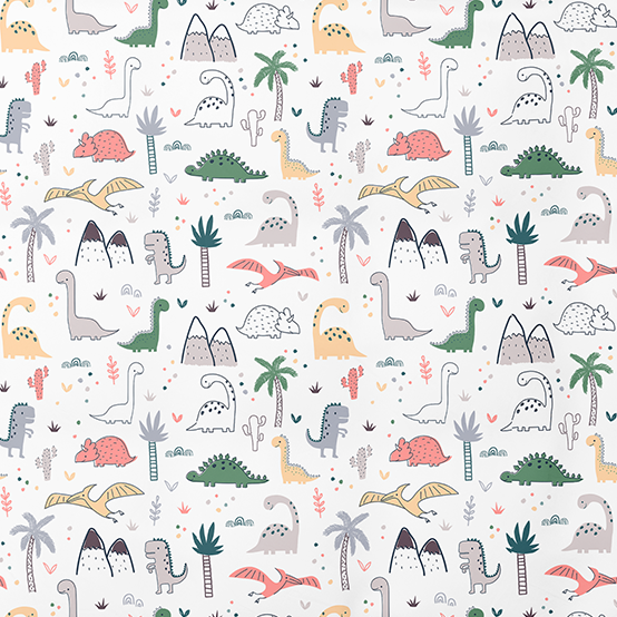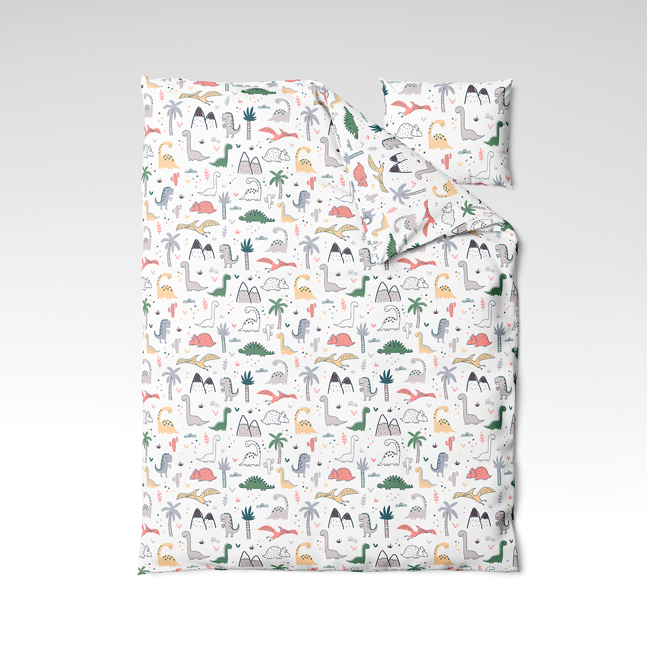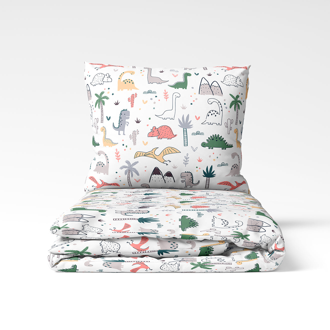 🦕 Dino Land - a cheerful and colorful design for little adventurers. Playfully arranged dinosaurs, trees, mountains, and clouds on a white background create a lively, friendly, and imaginative world. This bedding set is a journey to the land of dinosaurs every night!